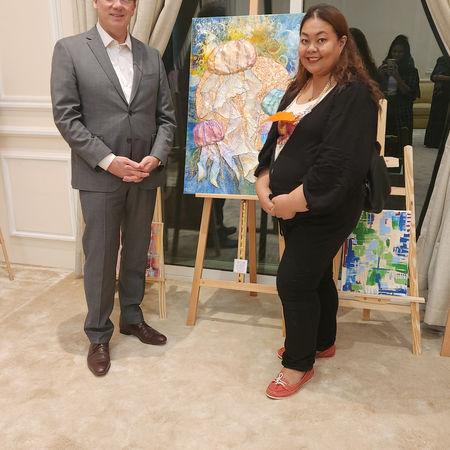 Art for A Cause at Rahma Animal Shelter curated by Cecilia Pitre 30 October 2022 My jellyfish got some attention from enthusiasts and environmentalists. an Environmental org interviewed me about it and we got invited to an event next year. With the French Ambassador, HE Ludovic Pouille, who came to support his daughter, who is also an artist